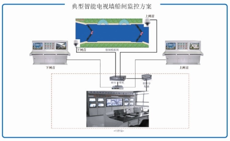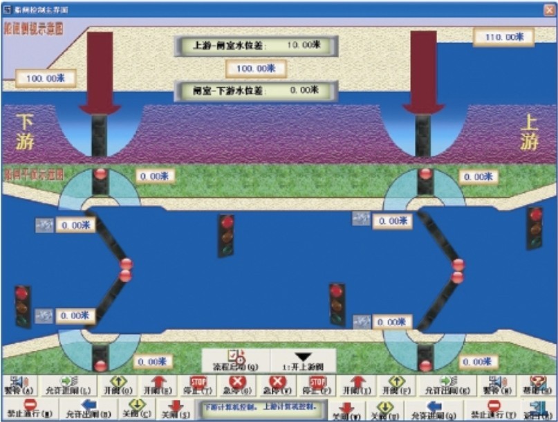 ![]() 一. 概述 本系统是根据我所多年的现场经验总结出的典型船闸控制系统。引人光纤通信、计算机网络、可编程控制器等先进技术,采用分层分布式计算机监控结构,使船闸实现了实时信息的采集、传输、动态监测监控、远程数据传输等功能,使船闸启闭、船只通行实现了自动化,从而大大提高了船闸的运行管理水平。本系统上、下闸首各有两扇人字门、两扇输水洞门,共8扇闸门。闸门采用液压启闭机启闭,通过阀组阀件的操作实现闸门的启闭;船闸的左右各有一套液压操作系统,每套油压装置有两台油泵(闸、阀门夜可采用齿轮、齿条启闭机或卷扬启闭机) 二. 系统构成 系统由闸管所服务器、中控室工控室及其现场控制单元三级构成。在中控室的一台研华工控机是船闸控制中枢,旁边设计有一面控制屏,屏上的控制单元设有一套PLC及其一台船闸水位、闸位测量仪,屏上还设有若干个按钮、指示灯作为集中手动操作方式。工控机与闸管所服务器之间通过光缆以太网连接。工控机与PLC之间通过UNI-TELWAY连接。工控机通过RS-485总线方式与船闸水位闸位测量仪连接。 三. 系统原理示意图 ![]() ![]() 四. 系统功能 1. 测量功能:测量水位信号、闸门状态及其开度信号、油压信号。 2. 显示功能: >指示灯显示:油泵运行与故障,闸门的开关状态; >LED数字显示:上游水位、下游水位、闸室水位、上闸收首水位差、下 闸首水位差; >中控室CRT显示:模拟船闸俯视图、各闸门的开关和动作状态(具有动画效果)、左右岸油泵的运行状态、泵站油压、上下游闸室水位及水位差的数字显示、三色交通指示灯显示、各种故障指示; >闸管所的CRT显示:监视内容完全同中控室CRT显示。 3. 操作控制功能: >在集中控制柜上以开关或按钮的方式进行常规手动操作各闸门的启闭,同时改变信号灯的颜色; >在工控机上用键盘、鼠标进行自动操作。 |