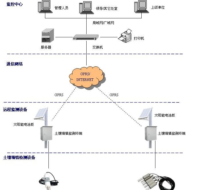 ![]() 一、概述 为了提高农牧业抗旱管理水平,快速掌握土地旱情动态,避免或减少旱灾造成的损失,逐步建立起广泛覆盖的土壤墒情监测系统已经成为相应管理部门的重要任务之一。 土壤墒情监测系统能够实现对土壤墒情(土壤湿度)的长时间连续监测。用户可以根据监测需要,灵活布置土壤水分传感器;也可将传感器布置在不同的深度,测量剖面土壤水分情况。系统还提供了额外的扩展能力,可根据监测需求增加对应传感器,监测土壤温度、土壤电导率、土壤PH值、地下水水位、地下水水质以及空气温度、空气湿度、光照强度、风速风向、雨量等信息,从而满足系统功能升级的需要。 土壤墒情监测系统能够全面、科学、真实地反映被监测区的土壤变化,可及时、准确地提供各监测点的土壤墒情状况,为减灾抗旱提供了重要的基础信息。 二、解决方案 1、系统构成 土壤墒情监测系统主要由监控中心、通信网络、远程监测设备和土壤墒情检测设备四部分构成。 ◆ 监控中心 硬件主要由服务器、计算机、交换机、打印机等组成。 软件主要有操作系统软件、数据库软件、土壤墒情监测系统软件组成。 ◆ 通信平台 包括中国移动GPRS网络和INTERNET公网。 系统计划采用公网专线的组网方式,监控中心需具备可上外网的固定IP地址。 ◆ 远程监测设备 远程监测设备可根据供电类型分为市电供电土壤墒情监测终端、太阳能供电土壤墒情监测终端和电池供电土壤墒情监测终端。 针对土壤墒情监测点分散分布、不易布线的特点,建议选用太阳能供电型土壤墒情监测终端。 ◆ 土壤墒情检测设备 根据监测需求,可采用1路土壤水分传感器实现单点墒情检测;也可采用多路土壤水分传感器,并将传感器布置在不同的深度,实现监测点的剖面土壤墒情检测。 2、系统拓扑图 ![]() 3、系统功能及特点 土壤墒情监测系统可实现全天候不间断监测。现场远程监测设备自动采集土壤墒情实时数据,并利用GPRS无线网络实现数据远程传输;监控中心自动接收、自动存储各监测点的监测数据到数据库中。系统主要功能如下: ● 符合最新墒情监测规范SL 364-2006。 ● 实时监测土壤水分,各监测点可灵活进行单路测量或多路剖面测量。 ● 土壤水分超过预先设定的限值时,立刻上报告警信息。 ● 可扩展土壤温度、电导率、PH值以及地下水参数、气象参数等监测功能。 ● 数据采集、存储频率可灵活调整,可远程设置监测设备工作参数。 ● 远程监测设备只在采集数据时才给传感器供电,一方面节约了能源,另一方面避免了因长期供电导致土壤物理性质变化所形成的测量误差。 ● 支持GPRS、短消息、局域网等多种通讯方式,推荐采用GPRS无线通讯。 ● 可同时将监测数据上报至多个中心。 ● 具备远程设备维护功能,可扩展远程拍照功能。 ● 具备监测数据、报警数据的统计、分析功能,数据报表可导出、可打印输出。 ● 监测系统软件具备GIS功能,可在地图上显示各监测点的详细分布位置。 ● 监测系统软件支持通过OPC接口与其它系统对接。 4、系统主要硬件设备 (1)土壤墒情监测终端 ◆ 安装方式:立杆安装或壁挂安装。 ◆ 供电方式:太阳能供电。 ◆ 对传感器供电电压:10~30V。 ◆ 与监控中心通信方式:GPRS。 ◆ 数据上报方式:实时上报。 ◆ 核心产品:监测终端内的核心产品选用YD-1003型低功耗测控终端。该产品集数据采集、显示、传输、存储功能于一体,采用低功耗设计,特别适用于太阳能供电的监测现场,可大大减少太阳能供电成本并降低施工难度。 (2)产品特点 ● 数据采集、传输一体化设计。 ● GPRS实时在线功耗低,在线平均电流≤10mA。 ● 可选配水文、水资源等多种数据传输规约。 ● 支持用户自行开发软件系统。 (3)技术参数 硬件配置:6路PI、4路DI、4路AI、3路DO、2路串口。 存储容量:4M。 供电电源:10V~30V DC。 功 耗:待机电流<0.1mA/12V; 在线电流≤6mA/12V; 发送电流≤60mA/12V; 实时在线平均电流:≤10mA/12V。 工作环境:温度:-40~+85℃;湿度:≤95%。 安装方式:导轨式。 (4)土壤水分传感器 水分是决定土壤介电常数的主要因素。测量土壤的介电常数,能直接稳定地反应各种土壤的真实水分含量。土壤水分传感器可测量土壤水分的体积百分比,与土壤本身的机理无关,是目前国际上最流行的土壤水分测量方法。土壤水分传感器是一款高精度、高灵敏度的测量土壤水分的传感器。 ● 性能指标 测量参数:土壤容积含水量。 单位:%(m3/m3)。 量程:0~100%(m3/m3)。 精度:±2%(m3/m3)。 测量区域:90%的影响在围绕中央探针的直径3cm、长为6cm的圆柱体内。 稳定时间:通电后约1秒。 响应时间:响应在1秒内进入稳态过程。 工作电压:12V~24V DC。 输出信号:4~20mA标准电流环。 密封材料:ABS工程塑料。 探针材料:不锈钢或铜。 电缆长度:标准长度5m。 遥测距离:小于1000米。 ● 主要特点 ① 高稳定性,安装维护操作简便。 ② 支撑的材料为环氧树脂,强度和寿命得到保证。 ③ 密封性好,可长期埋入土壤中使用,且不受腐蚀。 ④ 采用标准的电流环传送技术使其具有抗干扰能力强,传送距离远,测量精度高,响应速度快。 ⑤ 土质影响较小,应用地区广泛,适合中国国情。 三、设备安装现场展示 ![]() |