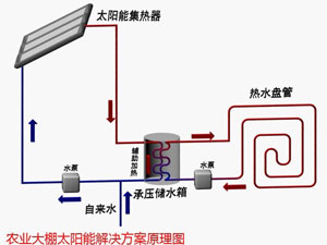 方案说明 温室大棚解决了农业上很多的问题,增加了用户的收入。利用太阳能与温室大棚结合可以更好的调节大棚内的温度,使得植物可以更好的生长。除此之外,也可以种植对温度要求更为苛刻的经济作物,并延长温室大棚的使用时间,为用户获得更好的效益。除此之外,通过对土壤的加热,也可以满足观赏温室及空中花园的需求。在很早就接触了太阳能种植,已经有了成熟的解决方案。 1、系统效果保证:透光性能好,温室提升温度快,温度控制稳定。 2、系统品质保证:保温性能好,控制系统可控制遮挡板开关从而控制大棚内温度。 3、系统集成设计:系统整体考虑,搭配辅助热源,专业软件分析,系统高效可靠,人性化设计。 4、系统质量保证: 对集热器、水箱、循环泵、管路等各个环节给予全面保障,确保系统安全稳定运行20年以上。 5、系统智能控制:全数据显示、智能化控制、分户计量、信息准确 原理图